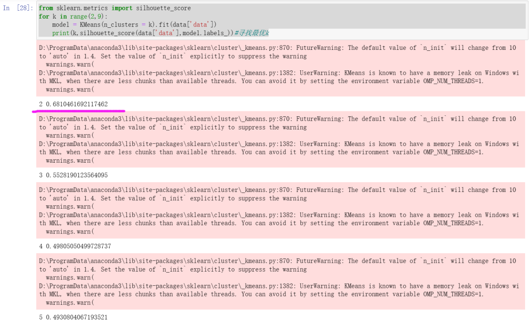from sklearn.metrics import silhouette_scorefor k in range(2,9):model = KMeans(n_clusters = k).fit(data['data'])print(k,silhouette_score(data['data'],model.labels_))#寻找最优k