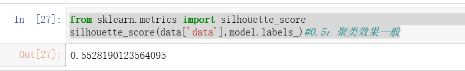 from sklearn.metrics import silhouette_scoresilhouette_score(data['data'],model.labels_)#0.5:聚类效果一般