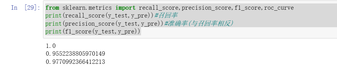 from sklearn.metrics import recall_score,precision_score,f1_score,roc_curveprint(recall_score(y_test,y_pre))#召回率print(precision_score(y_test,y_pre))#准确率(与召回率相反)print(f1_score(y_test,y_pre))