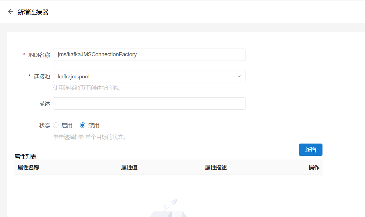 如果需要创建管理对象使用,可在页面【资源配置—连接器管理—管理对象】中创建,点击【新增管理对象】,填写JNDI名称,选择资源适配器、资源类型、类名称,添加响应的属性,点击保存,完成管理对象的创建。如: