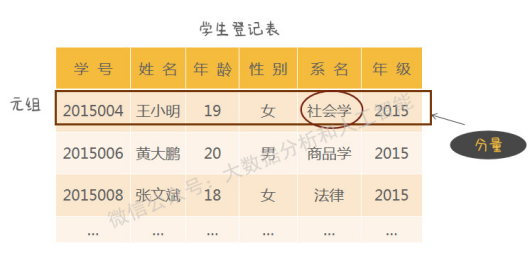 【分量】:在关系模式里,元组中的每个属性值称为分量