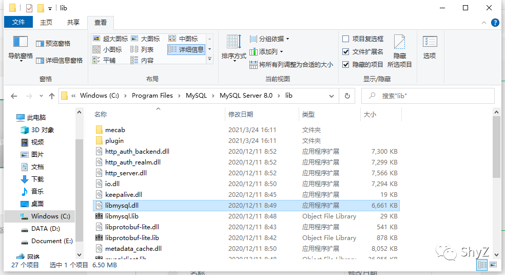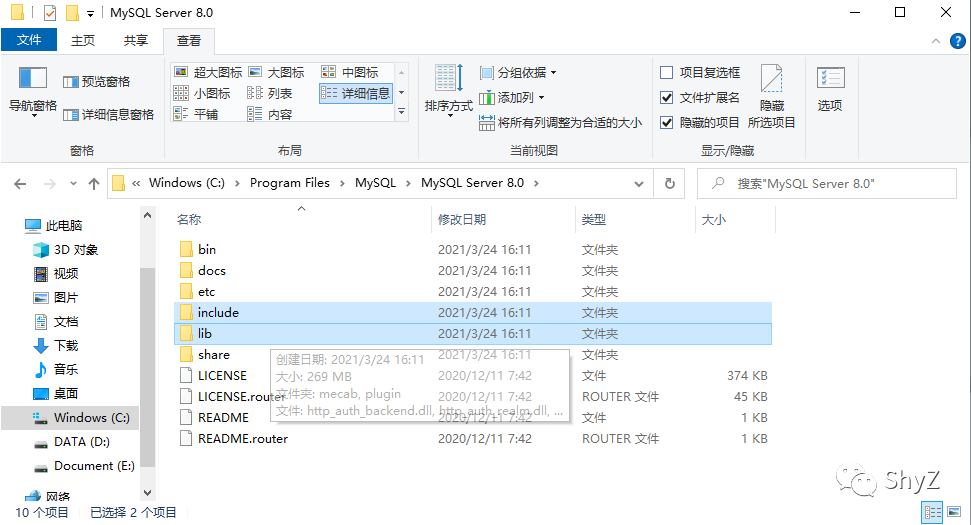 第一步:打开mysql的安装目录,我本地的安装目录如下:(注意是否有include和lib文件夹)
