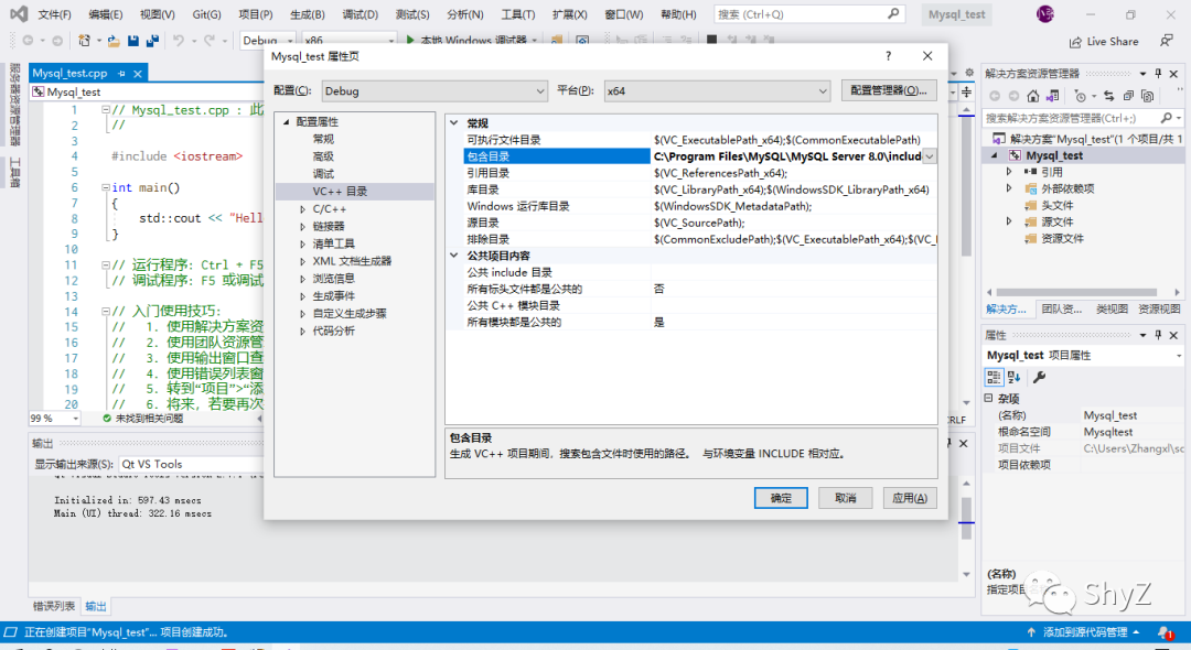 第四步:打开VC++目录,在包含目录中,将mysql安装文件中的include文件的路径添加到这里: