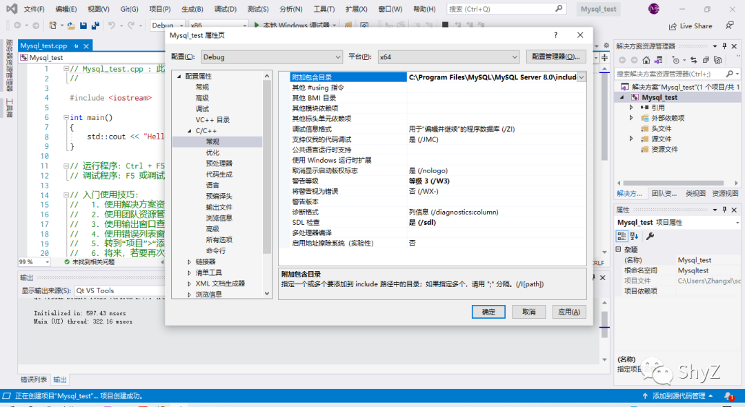 第五步:还是在属性页上,打开C/C++,选择常规,和上一步一样,在附加包含目录中将mysql文件中的include文件路径添加进来:
