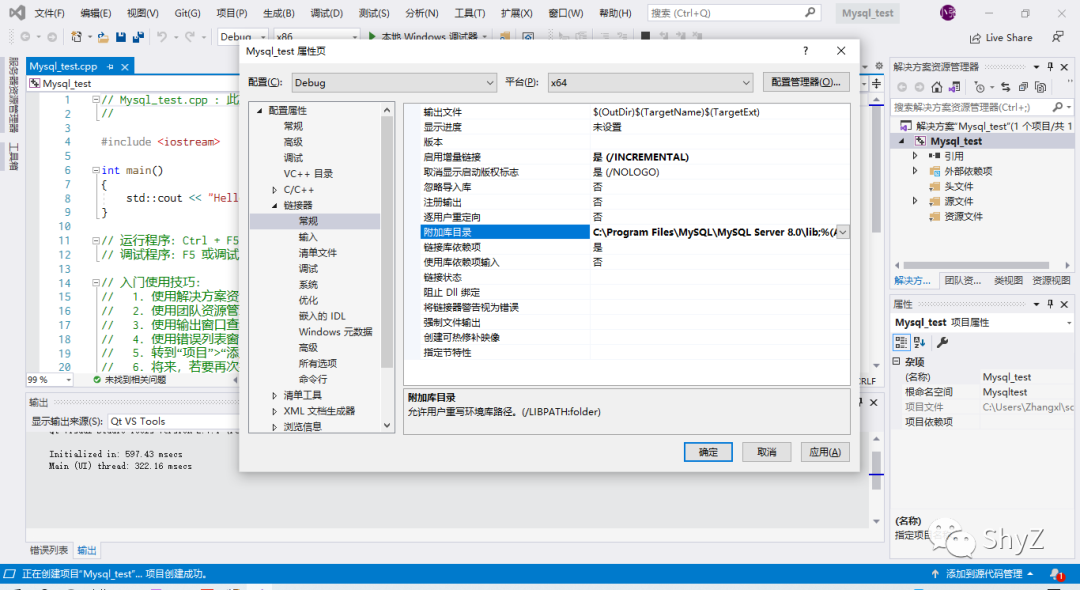 第六步:还是在属性页上,点开链接器选项,点击常规,将mysql安装文件夹中的lib文件路径添加到附加库目录中: