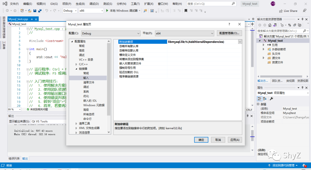 第七步:还是在属性页的链接器中,点击第二项输入,将libmysql.lib文件加进来,注意,这里直接把libmysql.lib这个依赖名加进去进行,不要加路径。这个文件也在mysql安装文件夹中lib目录下: