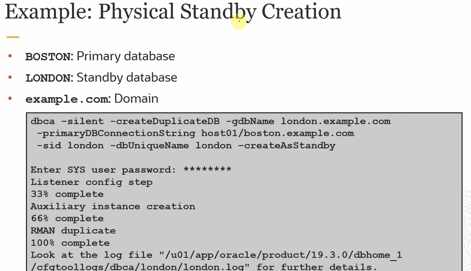 dbca -silent -createDuplicateDB -gdbName CDB19 -sid CDB19 -primaryDBConnectionString hostname:1521/ORCL -databaseConfigType SI -initParams db_unique_name=CDB19 -sysPassword password -datafileDestination /u02/app/oracle/oradata