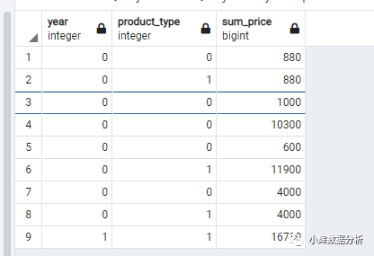 我们可以看到,rollup的结果是包含在cube的结果当中的。但是,我们有的时候,并不想得到cube或rollup中的全部结果,我们只想得到一部分结果,此时,我们可以使用grouping sets来完成这一个需求。