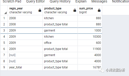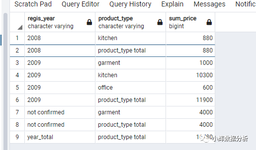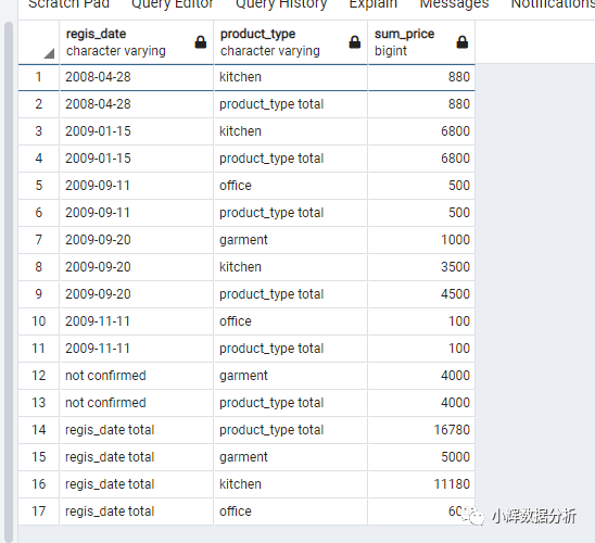 现在,我们来稍微总结一下group by,group by rollup,group by cube,group by grouping sets四个命令在汇总结果上的不同(以regis_date和product_type为例):