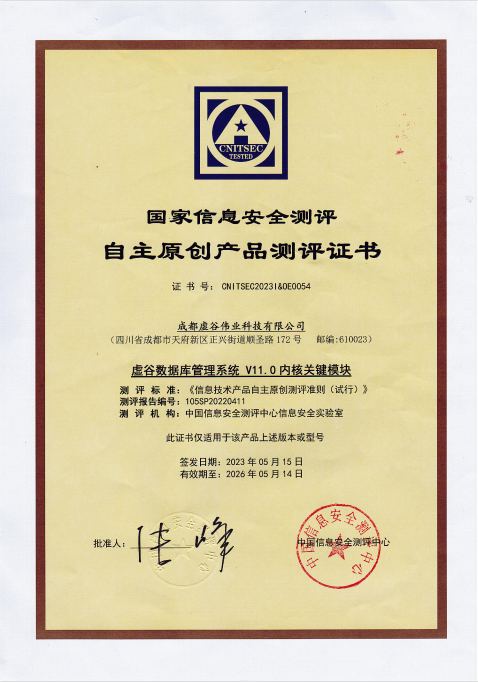 近日,经中国信息安全评测中心(简称:国测中心)综合分析评定,成都虚谷伟业科技有限公司的"虚谷数据库管理系统V11.0"的内核关键模块满足国测中心自主原创测评要求。