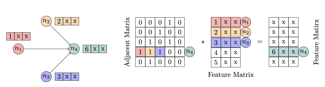 图1. 这是一个在GNN中使用聚合求和的g-SpMM操作示例。左侧是将顶点𝑛1、𝑛2和𝑛3的特征向量聚合到顶点𝑛4上。右侧,我们将图表示为邻接矩阵,以便计算顶点的特征向量作为一个SpMM操作。