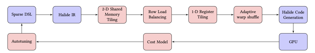 我们提出了GPC来加速GNN中的广义稀疏计算,利用DSL编译器来分离算法和调度。GPC通过引入非矩形缓冲区边界推断和缓冲区绑定索引,扩展了Halide,以实现对稀疏内核的DSL描述和代码生成。此外,GPC在调度中引入了2D共享内存平铺、行负载平衡、1D-stride寄存器平铺、自适应warp shuffle等优化,以提高数据复用效率和显著改善行负载平衡。GPC引入了一种基于DNN的成本模型,结合遗传搜索自动调整,可以在不需要人工干预的情况下自动搜索最优结果。