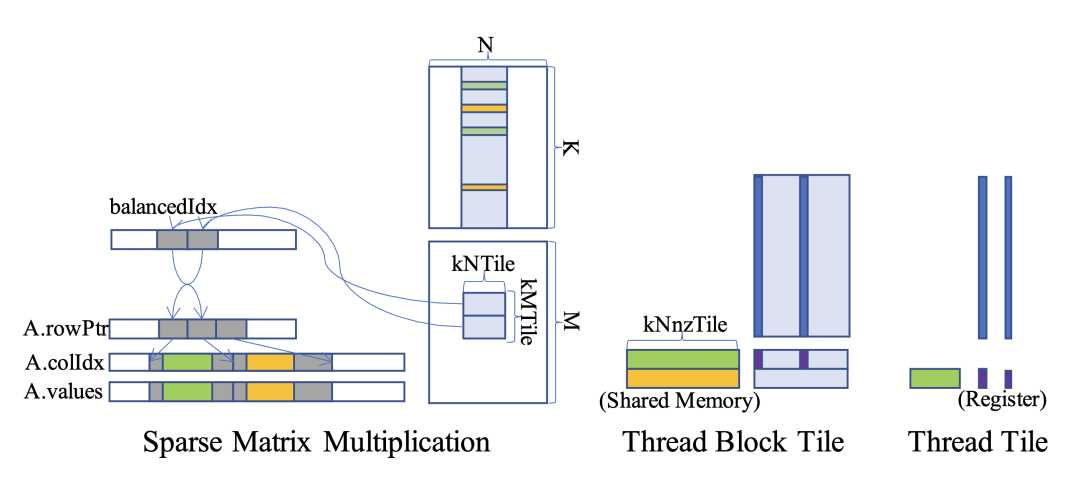 图3. GPC对g-SpMM算子的优化,包含Shared Memory Tiling、Register Tiling以及Row balance等优化。