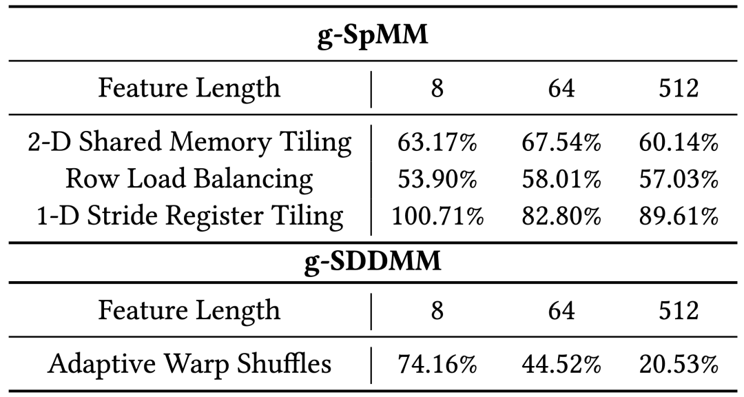 表1. 对于g-SpMM操作,2-D共享内存平铺和行负载平衡优化对性能影响最大。对于g-SDDMM操作,是否使用warp shuffle指令对性能至关重要。