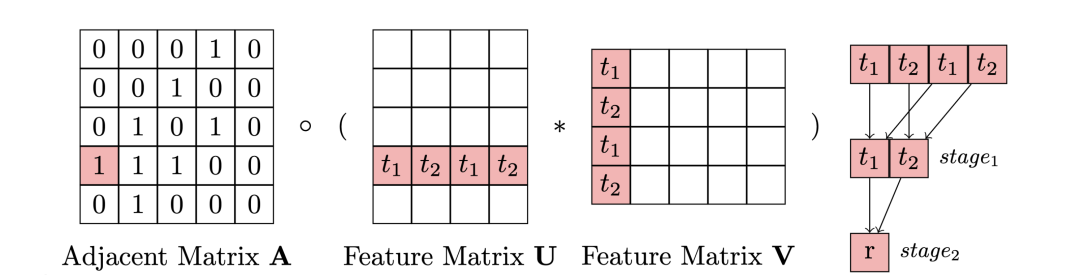 图4. g-SDDMM算子以及对应GPC对其的优化。在𝑠𝑡𝑎𝑔𝑒1中,线程𝑡1和𝑡2分别计算矩阵𝑈和𝑉的部分点积结果。𝑆𝑡𝑎𝑔𝑒2使用warp shuffle将𝑡1和𝑡2的部分结果相加以得到最终结果𝑟。