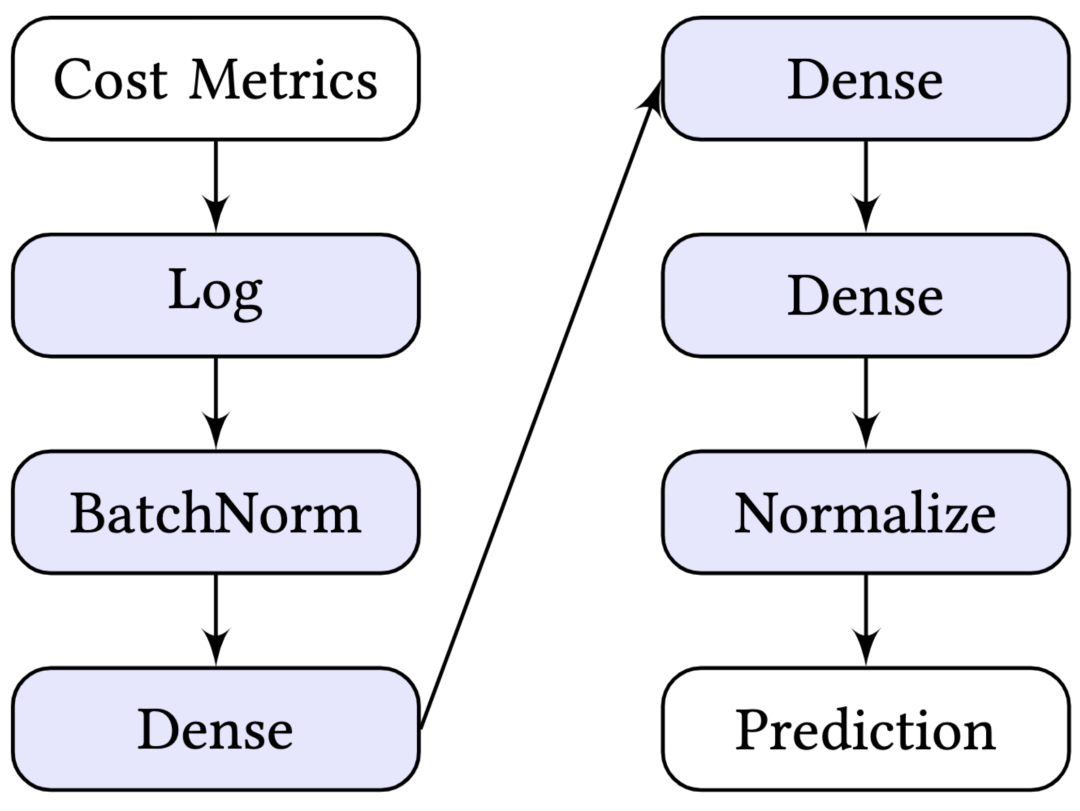 我们还引入了一种基于广泛搜索空间的成本模型自动调整方法,以自动搜索最佳结果。我们的成本模型是一个简单易训练的DNN,如图5所示。模型结构的第一层是对数函数,第二层是批量归一化,接着是三个密集层,最后一层是归一化层。使用均方误差计算损失。真实数据进行归一化以更好地反映真实趋势,使得𝑙𝑜𝑠𝑠 = 𝑀𝑆𝐸 (𝑦𝑝𝑟𝑒𝑑𝑖𝑐𝑡𝑒𝑑 , 𝑛𝑜𝑟𝑚𝑎𝑙𝑖𝑧𝑒 (𝑦))。使用表示并行性的一组度量值,以及GPU块平铺大小、共享内存平铺大小、寄存器平铺大小和自适应warp shuffle的adaptive-lane宽度等,来形成搜索空间。