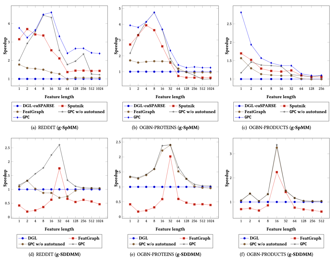 如图6所示,我们的性能在大多数经过测试的数据集和特征长度上,超过了cuSPARSE、DGL、FeatGraph和Sputnik。