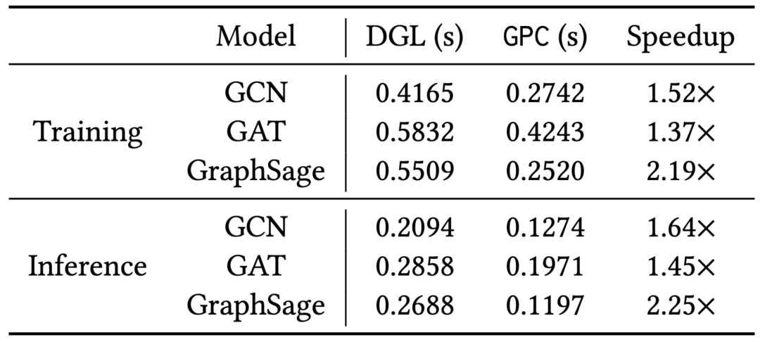 另外,我们对比了DGL和GPC在GCN、GAT和GraphSage模型上的端到端性能,数据集使用了Reddit,如表格7所示。可以看到,使用GPC的DGL在所有模型上性能优于原始DGL,训练的平均加速比为1.69×,推理的平均加速比为1.78×。