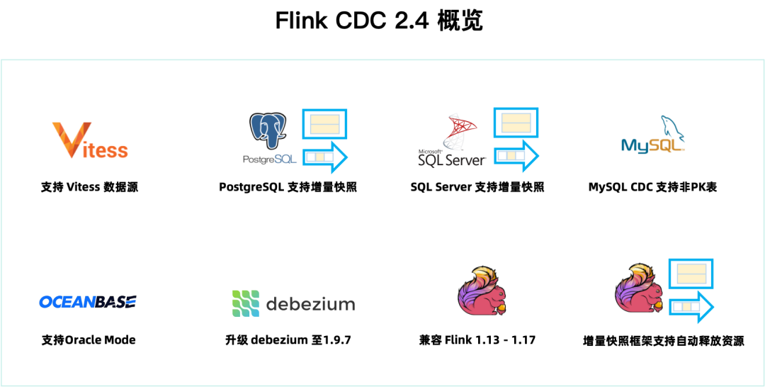 本文通过下图带你 10 分钟快速了解 Flink CDC 2.4 版本的重大改进和核心特性。