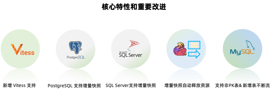 PostgreSQL CDC,SQL Server CDC 两大连接器均接入了增量快照框架,从而提供了无锁读取,并发读取和断点续传的能力。