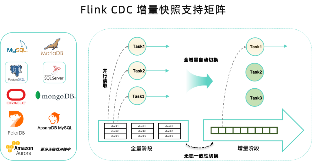 2.4 版本中,PostgreSQL CDC 连接器和 SQL Server CDC 连接器都对接到了 Flink CDC 增量快照框架上,实现了增量快照算法,从而提供无锁读取,并行读取和断点续传的功能。