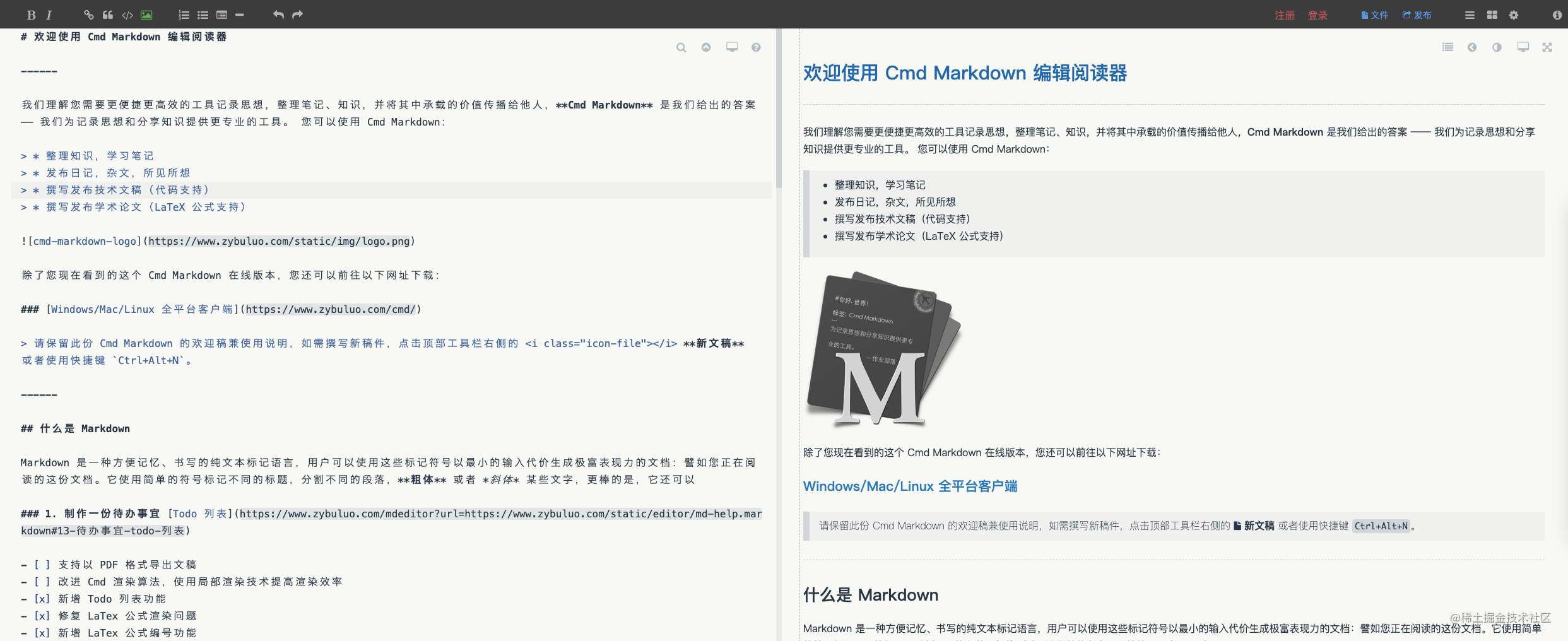 支持表格、TOC、LaTeX、代码块、任务列表、脚注等。