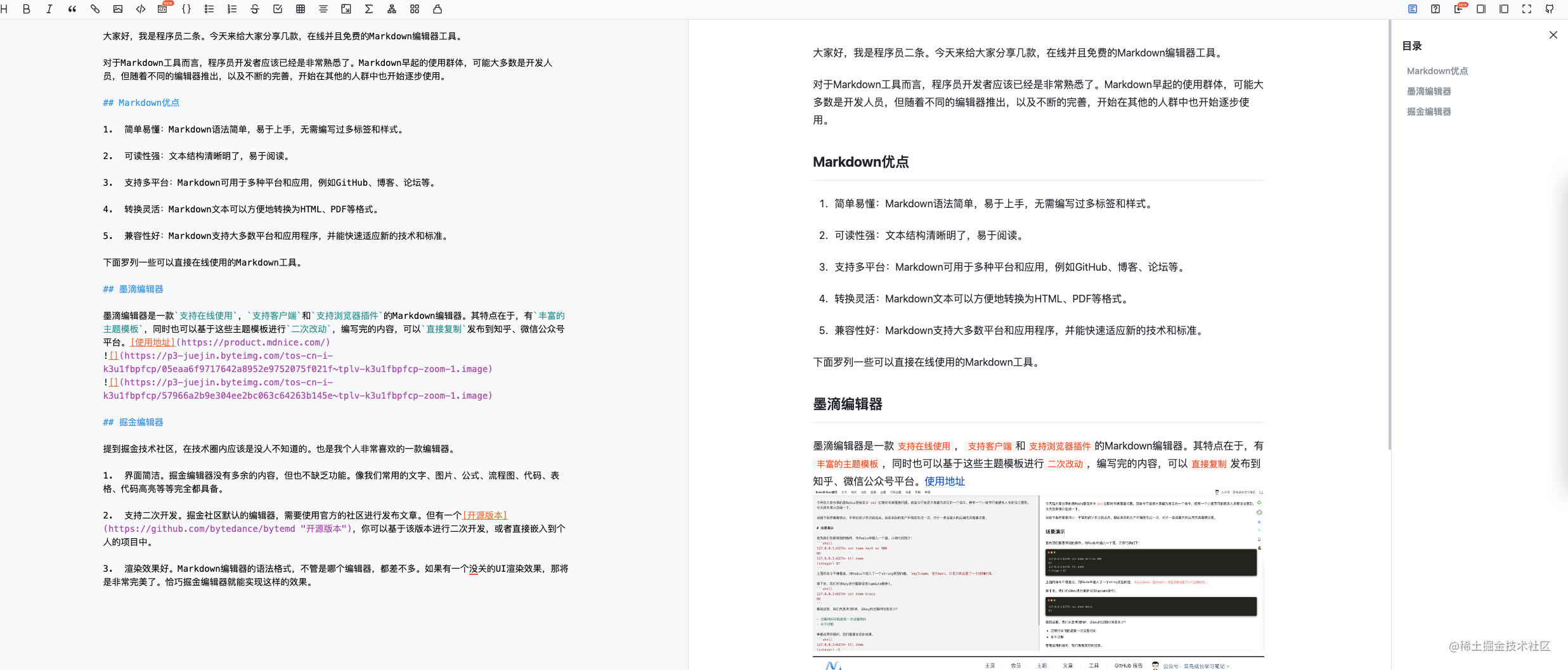 渲染效果好。Markdown编辑器的语法格式,不管是哪个编辑器,都差不多。如果有一个没关的UI渲染效果,那将是非常完美了。恰巧掘金编辑器就能实现这样的效果。