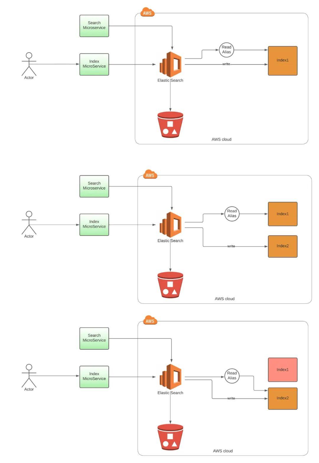 为了适应更新和修改,创建了一个新版本的索引 “index2”。这个新版本将存储更新的产品信息。而搜索应用程序,在运行时通过 readAlias 从 Index1 读取数据。