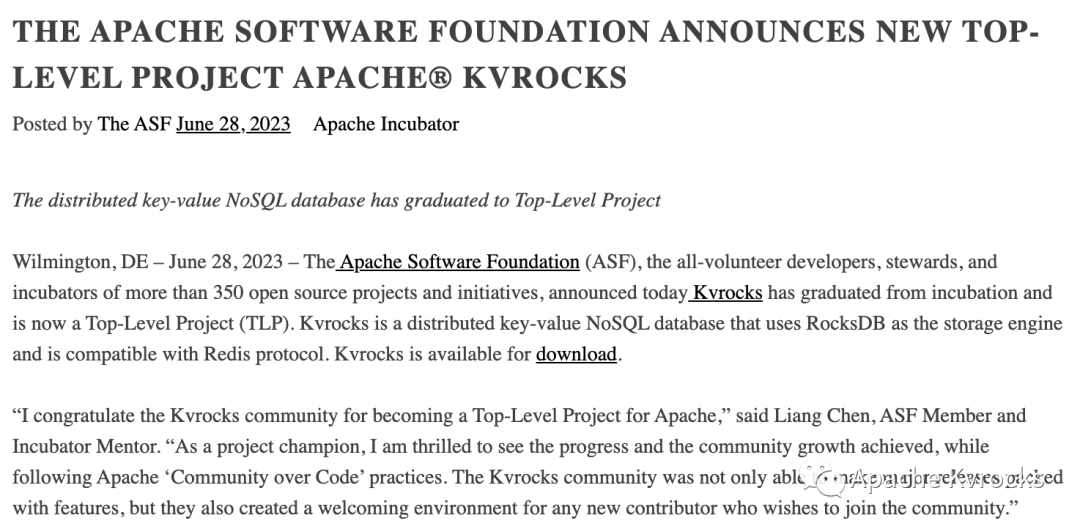 Apache 软件基金会(简称 Apache)于美国时间 2023 年 6 月 28 日宣布 Kvrocks 从孵化器毕业成为顶级项目: https://news.apache.org/foundation/entry/the-apache-software-foundation-announces-new-top-level-project-apache-kvrocks