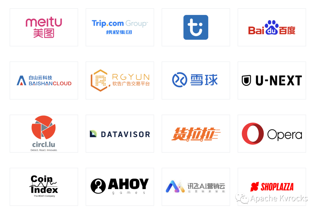 通过 GitHub 的 Issue: Who is using Kvrocks?[2] 收集到正在使用 Kvrocks 的用户,不仅包含国内的 Meitu / 携程 / 百度 / 雪球等知名公司,也有不少来自欧洲的公司,如 circl.lu,Coin Index 以及游戏公司 AHOY Games,还有来自日本的影音平台 U-Next 等。十分感谢这些用户主动分享用例,才让更多人看见 Kvrocks。