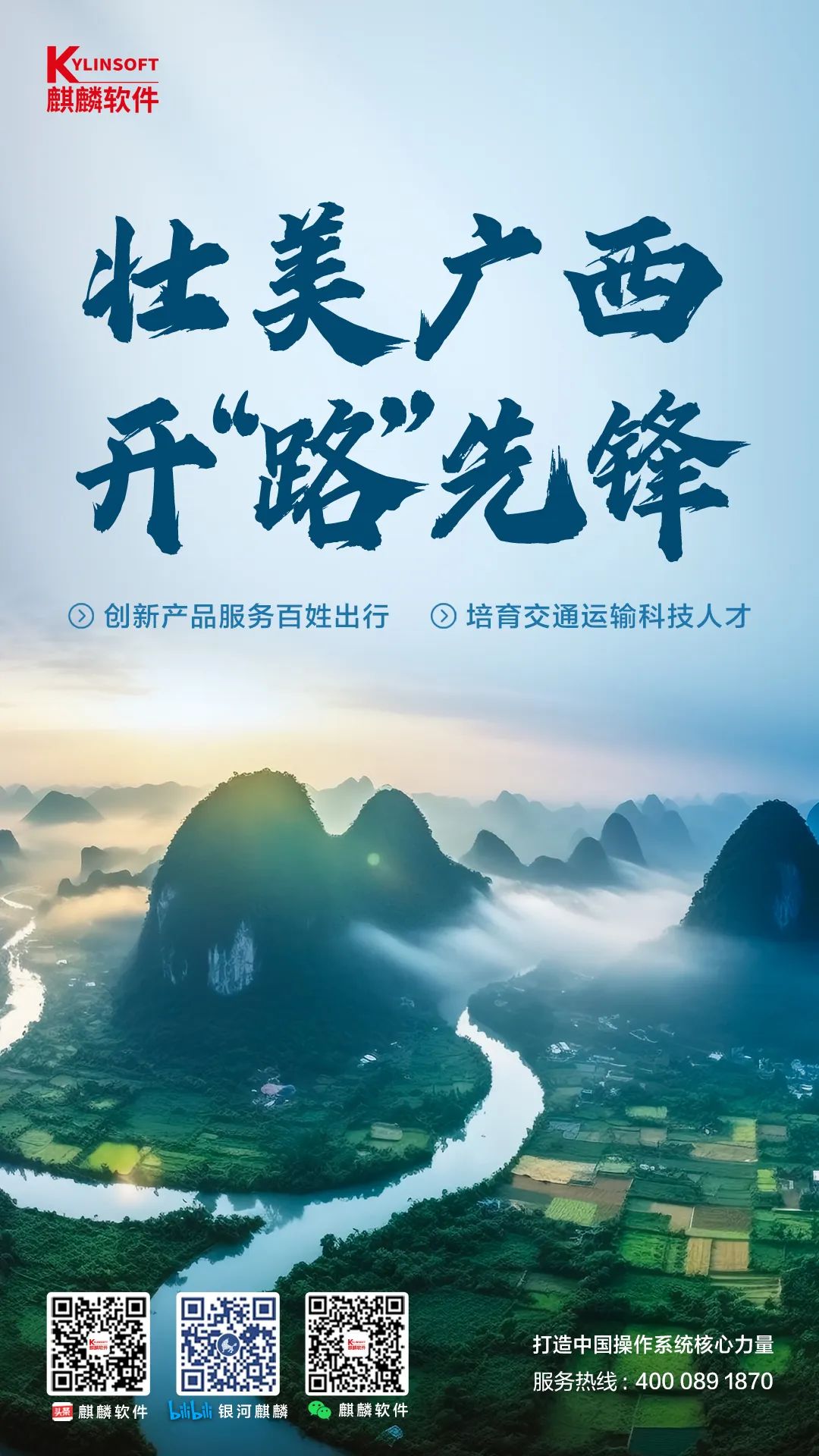 壮美广西,云遮雾绕别样美。广西举全区之力高水平建设西部陆海新通道,发挥区位优势,主动作为,在交通运输事业中不断取得突破性进展。麒麟软件也将在广西交通运输事业高质量发展的过程中,以优质的产品和服务支撑本地交通信息化建设,为广西交通运输科技创新持续贡献力量。