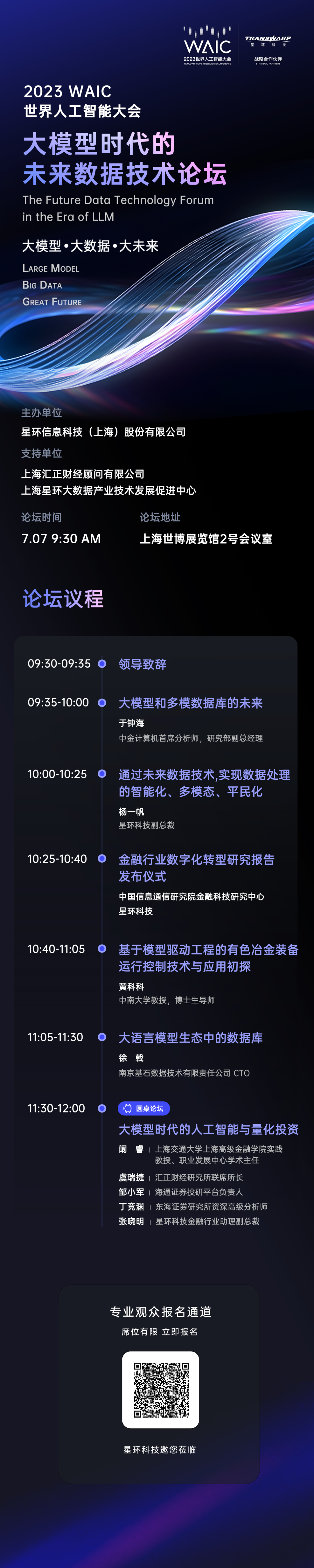 大模型时代的未来数据技术论坛聚焦大数据·大模型·大未来,由星环科技主办,上海汇正财经顾问有限公司、上海星环大数据产业技术发展促进中心支持,将邀请来自中金、中国信息通信研究院金融科技研究中心、中南大学、南京基石数据技术有限责任公司、上海交通大学、汇正财经、海通证券、东海证券的专家们,共同探讨大模型时代的未来数据技术,助力企业抓住大模型时代的新机遇。同时星环科技还将联合中国信息通信研究院金融科技研究中心发布《金融行业数字化转型研究报告》。