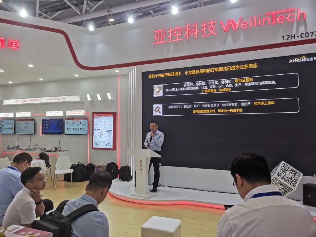 爱家云信息科技有限公司SAP咨询总监肖真奉先生带来《SAP助力企业供应链高效管控》演讲,演讲中提到小批量多品种生产订单模式成为企业常态,企业需要统一平台解决高交期,高库存和高成本问题。肖总分享了离散制造企业典型的业务痛点问题,实现成千上万产品柔性敏捷交付是企业的心声,通过产品分类交付,承诺交期,通过快速影响来提升客户体验感。亚控和爱家云联合打造的全数字化端到端一体化数字管控平台可以更好的解决上述问题。如帮助企业解决战略物资的预测采购、常规物资安全采购、一般物资定期采购的采购问题;如通过规定工序节拍、降低工序产能来平衡产线节拍让生产产出率合理且均衡;如通过设置MRP参数、异常信息和产线能力信息,利用亚控高级计划排程功能,解决企业供需平衡功能解决生产数量不准和时间不准的难题。肖总的分享得到了许多现场观众的关注,大家纷纷提出自身需求问题,在现场同亚控深圳分公司技术人员进行沟通交流。