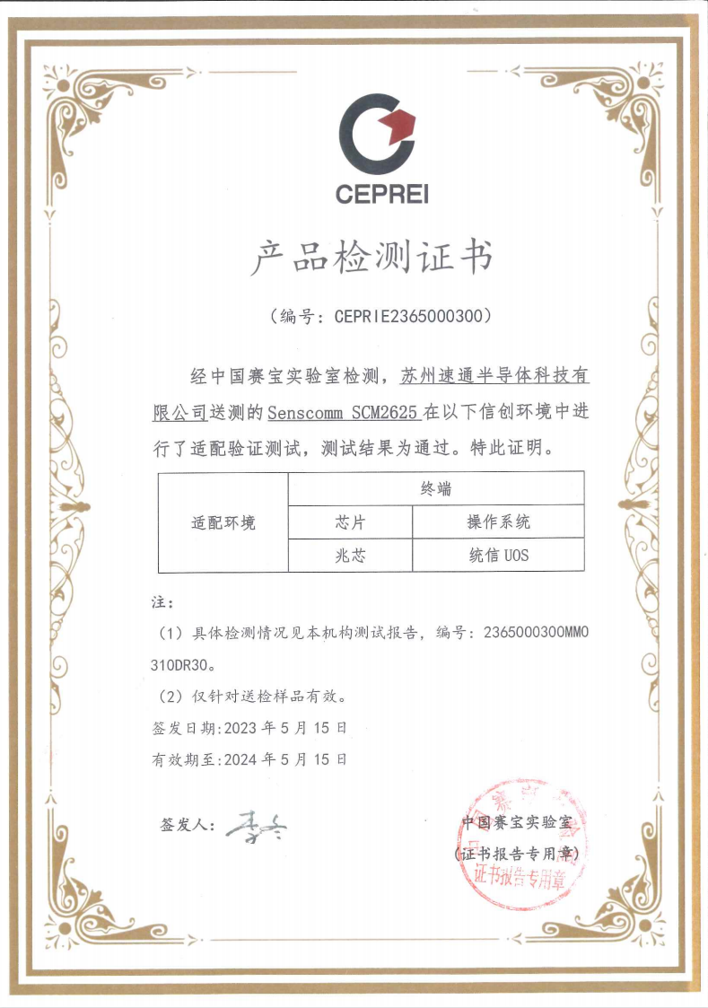 近日,苏州速通半导体科技有限公司(简称“速通半导体”)自主研发的Senscomm Wisen-2(SCM2625)芯片基于统信UOS+兆芯CPU平台成功通过赛宝实验室检测,并且取得了测试项目全数通过的优异成绩,成为国内首款通过该认证的全自研2x2双频Wi-Fi 6芯片。