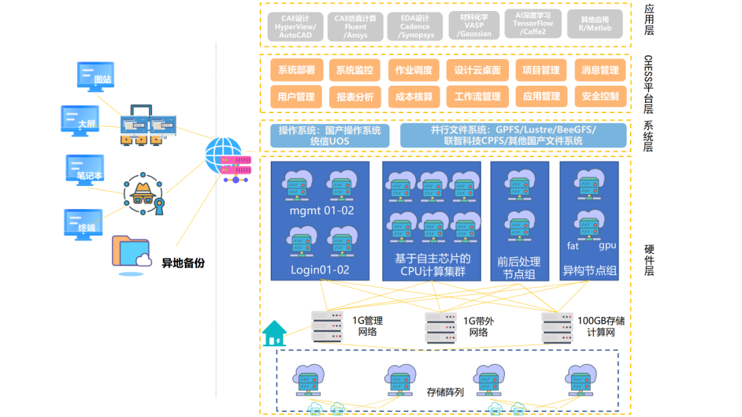 满足客户对自主集群系统计算性能优、存储容量大、安全等级高的多重需求,帮助党政军教和其他国计民生关键领域的客户解决复杂的自主集群搭建难题,打破计算资源瓶颈,加速实现研发环境的安全可控。