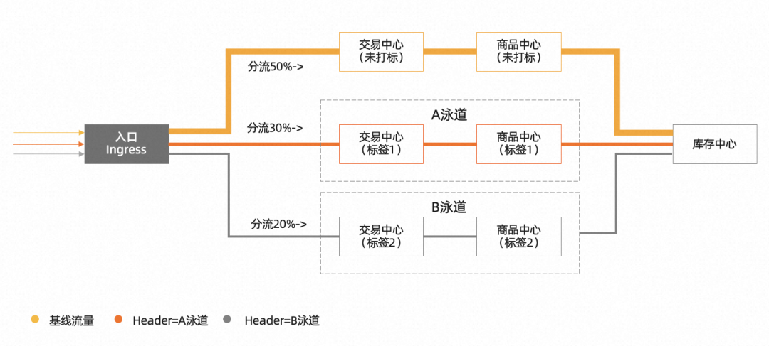 泳道:为相同版本应用定义的一套隔离环境。只有满足了流控路由规则的请求流量才会路由到对应泳道里的打标应用。一个应用可以属于多个泳道,一个泳道可以包含多个应用,应用和泳道是多对多的关系。基线环境:未打标的应用属于基线稳定版本的应用,即稳定的线上环境。流量回退:泳道中所部署的服务数量并非要求与基线环境完全一致,当泳道中并不存在调用链中所依赖的其他服务时,流量需要回退至基线环境,进一步在必要的时候路由回对应标签的泳道。泳道组:泳道的集合。泳道组的作用主要是为了区分不同团队或不同场景。入口应用:将符合流控规则的流量打上对应的灰度标识,并使该流量在下游应用中走到对应的应用版本中。由于在本案例中实际使用场景中为 MSE 云原生网关+EDAS,其打标能力全部集中在 MSE 云原生网关上。从上图中可以看到,用户分别创建了泳道 A 与泳道 B,里面涉及了交易中心、商品中心两个应用,分别是标签标签 2,其中 A 泳道分流了线上 30% 的流量,B 泳道分流了线上 20% 的流量, 基线环境(即未打标的环境)分流了线上 50% 的流量。