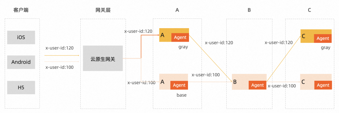 1. 前端到后端能够按照按照不同的复杂规则(如 header 中的城市、UserID 等)做精细化路由控制,同时当下游服务灰度版本存在异常或不存在时,能够降级至基线服务处理请求。