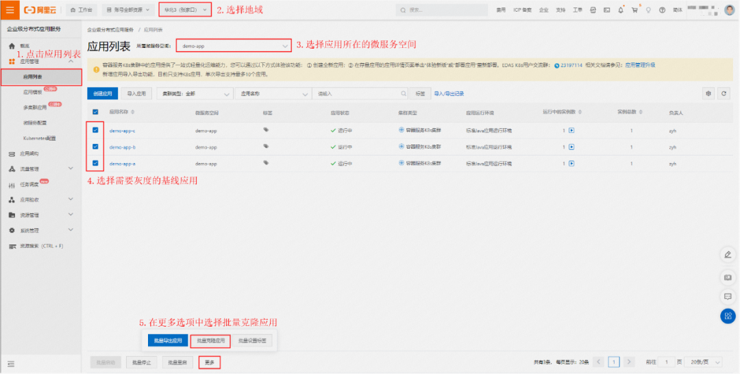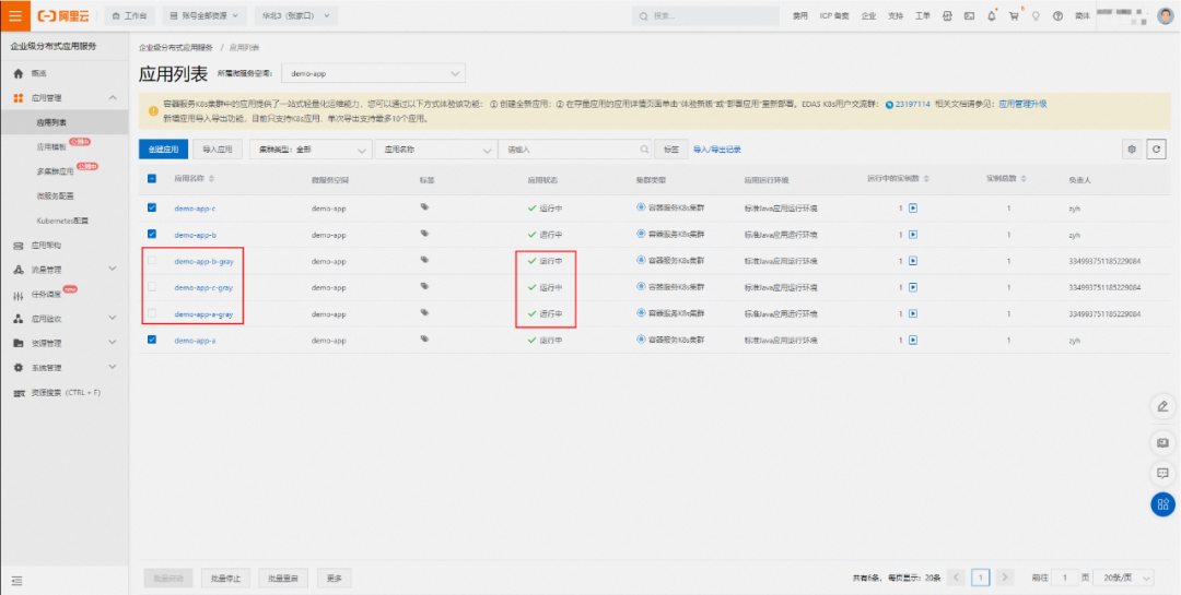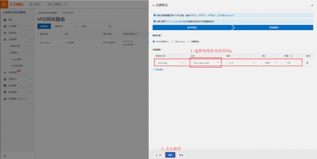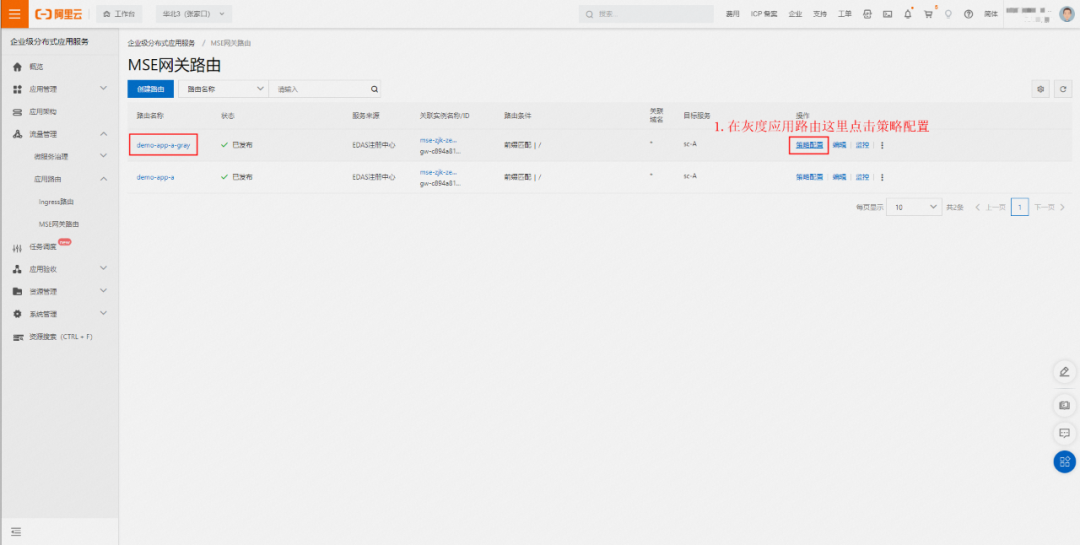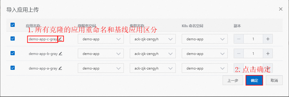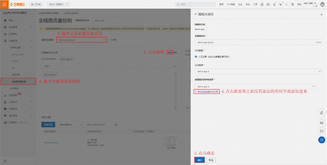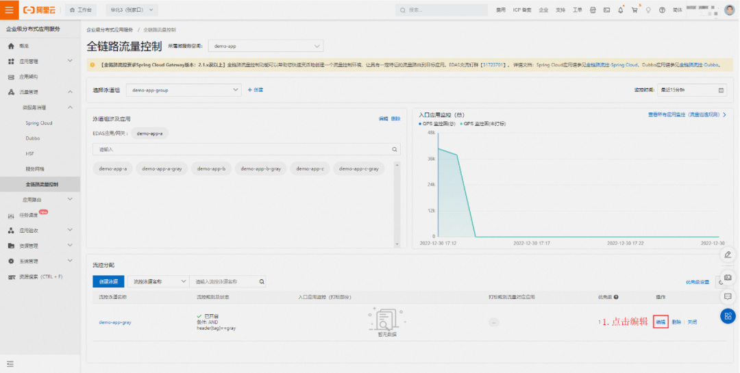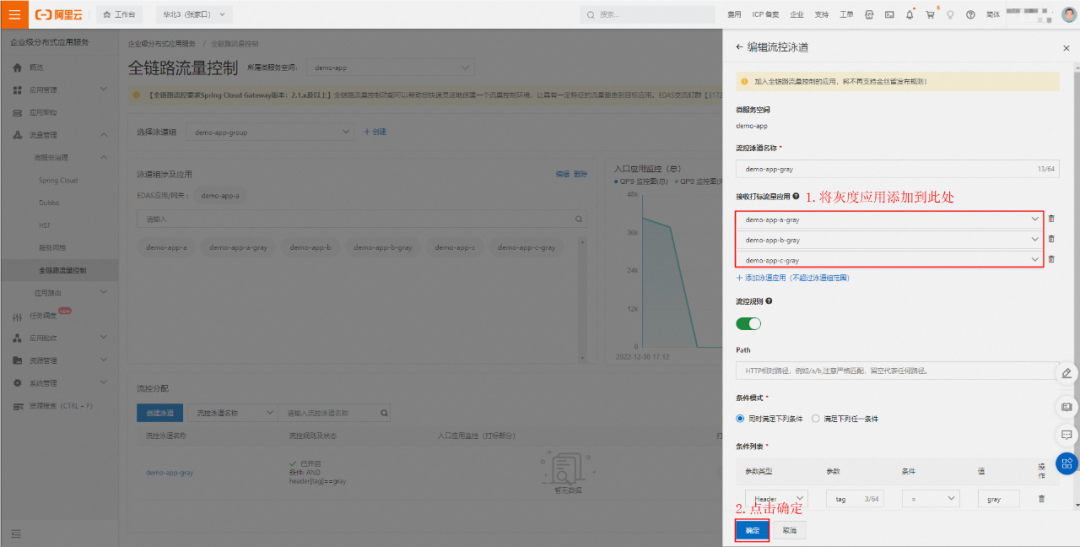 通过在 deployment 上配置注解 alicloud.service.tag: gray 标识应用灰度版本,并带标注册到注册中心中,在灰度版本应用上开启全链路泳道(经过机器的流量自动染色),支持灰度流量自动添加灰度 x-mse-tag: gray 标签,通过扩展 consumer 的路由能力将带有灰度标签的流量转发到目标灰度应用。在创建泳道时需要选择入口类型,目前仅支持部署在 EDAS 中的入口应用作为泳道入口应用,需要将泳道中涉及的基线版本和灰度版本添加到泳道组涉及应用中。创建完成后会生成新泳道,点击泳道名称,将泳道标签值记录下来,本示例为 f2bb906。通过 edas 将应用克隆出灰度(gray)版本,选中所有需要灰度的应用。给所有灰度应用重命名,命名规则是在基线应用名称的后面加上 -gray 作区分,点击确定,等待应用克隆完成。当看到所有应用(包括灰度版本应用)已经处于运行中状态且实例数正常,即可进行下一步。回到全链路流量控制页面,找到之前创建的泳道组,点击编辑,将基线和灰度应用都添加进泳道组中,然后点击确定。