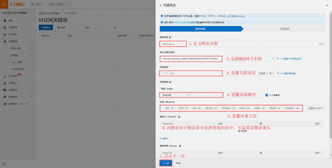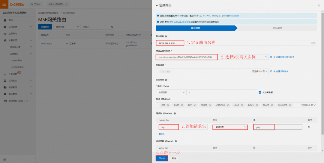 在创建完成的灰度泳道中添加灰度应用,找到灰度泳道,点击编辑,添加泳道应用,选择 gray 版的应用。在 EDAS 控制台左侧菜单栏中选中流量管理-应用路由-MSE 网关路由,点击创建路由。定义路由名称,选择 MSE 网关实例,配置关联域名、匹配规则、请求方法等,这里的路由是到基线应用,无需配置请求头(即无需匹配灰度规则)。服务来源选择 EDAS 注册中心,目标填入基线应用 a 的配置。注:这里如果选择应用后没有可选的服务,需要检查 k8s 集群上的 agent 状态。再创建一条 MSE 网关路由用于灰度版本应用,定义路由名称,选择 MSE 网关,添加请求头,key=tag,value=gray,在目标服务中选择灰度应用版本的 a 应用。给灰度路由添加策略配置,添加 Header 规则,其中 header key:x-mse-tag,header value: 的值为在第 4 步获取的泳道标签,添加规则后并将开启状态开关打开。添加完成后将对应 base 以及 gray 路由发布上线。在完成路由策略配置后,对网关后对应的下一跳服务路由,设置 fallback 目标服务到基线服务。流量入口:入口应用微服务体系内的流量入口,该场景下对应的是 MSE 云原生网关。