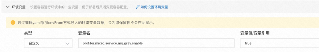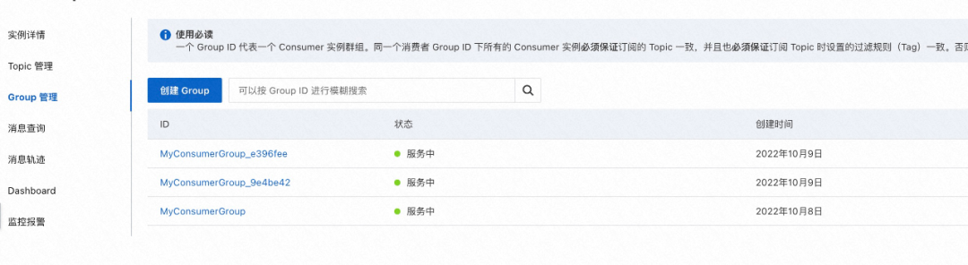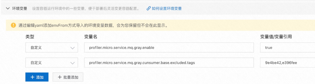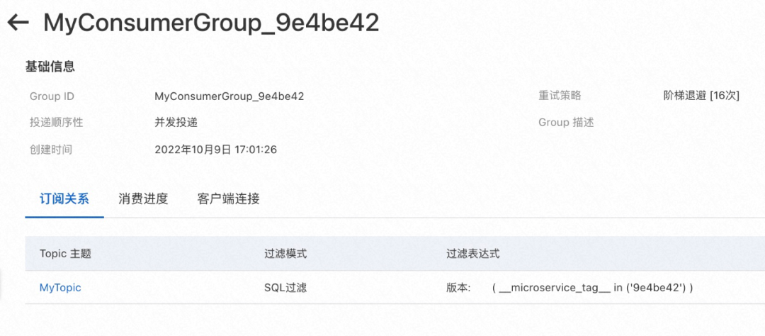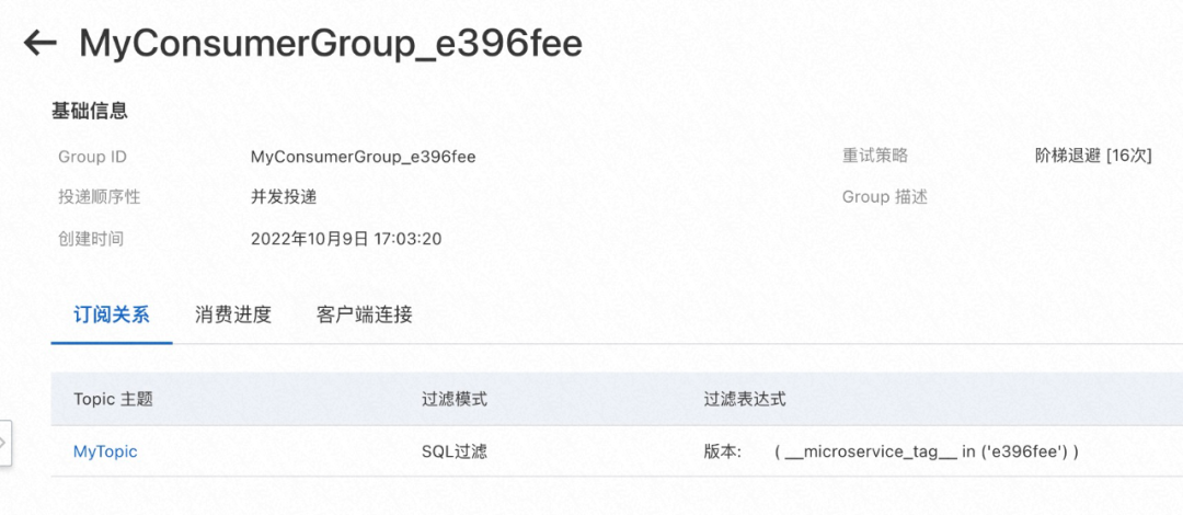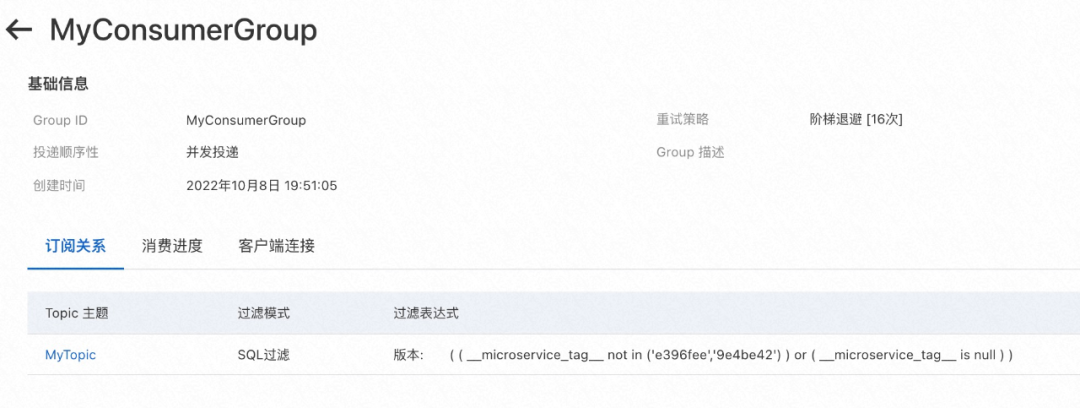 在介绍完了 RocketMQ 订阅模式之后,再一起看下消息灰度的实现方案。灰度发布的本质是解决环境隔离的问题。通过不同消息者分组区分正常和灰度版本。在不改变代码及应用配置的情况下,通过服务治理层的 agent 完成消息从发送到订阅的处理逻辑,整体方案思路如下:1. 创建对应消费者组:首先需要用户对当前每个消费者分组预创建的对应的消费者分组 _grayID。例:serviceA_group 对应的分组名为 service_A_group_grayID。(备注:命名必须按照 _gray 的规范创建,否则 agent 在获取到对应的灰度标识之后,无法将 service 同消费者分组建立关联,或直接报错消费者分组不存在)2. 消息染色:通过用户定义的灰度环境分组,为对应的服务染色并打上环境标识。当服务开始正常发送消息到对应的 Topic 时,通过服务的agent劫持到对应的消息后,打上自定义标签 putUserProerty("__gray_tag__", "$灰度标识"),并将消息放到对应的 Topic。3. 动态建立订阅关系:当消费者被添加到对应的环境之后,会基于环境标识被分配到对应的消费者分组中。并基于消费者组同 Topic 动态建立订阅关系。4. 消息过滤:由于生产者会将无论是灰度环境还是生产环境的消息推送到同一个 Topic 中,因此不同的消费者组需要基于对应环境的消息过滤进行消费。在技术实现上,RocketMQ 基于 Tag 和消息属性两种方式均能满足业务场景。方案中之所以采用自定义消息属性的方式,更多的是出于工程实践的考虑。由于消息 Tag 对于一条消息仅支持添加一个 string 类型的消息,在一些业务场景下,可能 Tag 会被应用的业务场景所占用,从而出现不可控的场景,因此通过自定义消息属性,再消费者的 agent 端基于 SQL92 语法实现消息过滤,从容错性上相对更优,因此推荐使用自定义消息属性实现消息分组。该方案的主要优势在于对于管理和使用人员来说,没有太高的使用成本,在实际完成灰度发布过程中,无需频繁修改代码及对应配置信息。在泳道列表中查询到已创建应用的基线、灰度泳道,点击泳道名称查看泳道详情,并获取泳道标签。如上图,取得 dev1 泳道标签为 9e4be42,dev2 泳道标签为 e396fee。登录消息服务 RocketMQ 控制台,根据上一步骤获取的泳道标签创建灰度消费者组。如图所示,根据步骤 3 获取的泳道标分别创建消费组 MyConsumerGroup_e396fee 和 MyConsumerGroup_9e4be42。在 EDAS 控制台选择应用管理,进入应用列表。找到(需要进行灰度流控的消息生产者和消费者)应用 B、应用 B-dev1、应用 B-dev2、应用 C、应用 C-dev1、应用 C-dev2,进入应用详情页进行部署并添加以下环境变量:profiler.micro.service.mq.gray.enable=true