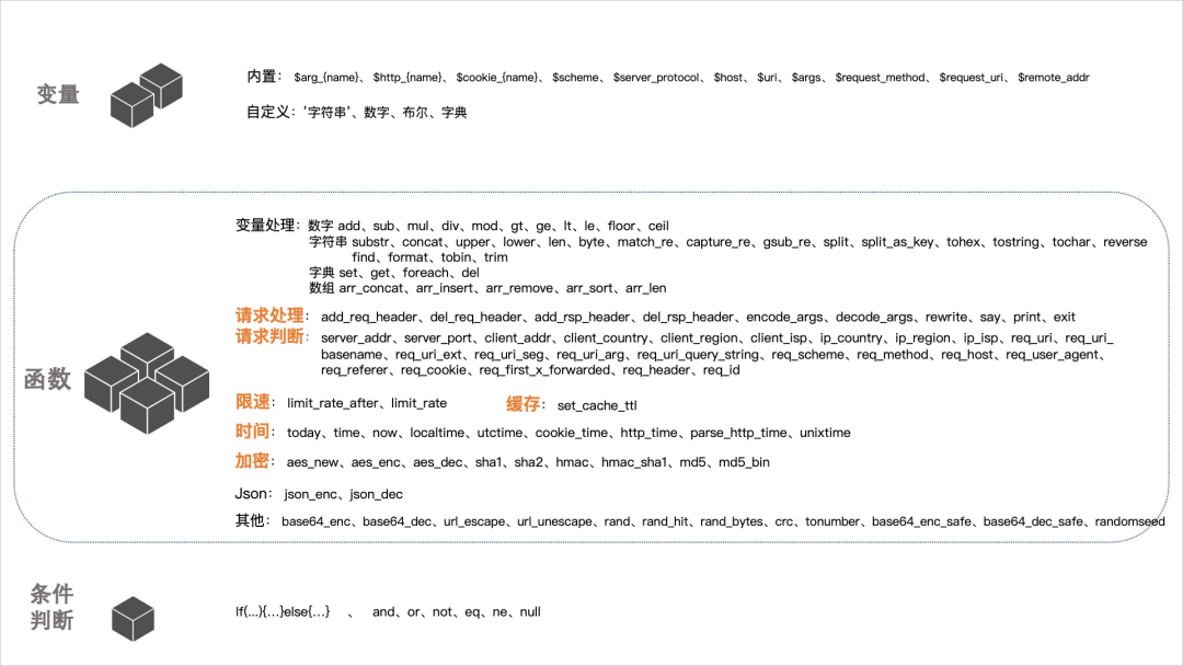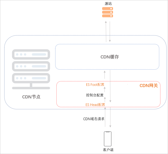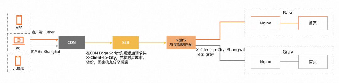 在实际项目中,基于 http_x_forwarded_for 的灰度请求,由于需要枚举出对应的请求 IP,对于客户端有明确的指向性,主要能够解决开发测试人员在发布完成后,在生产环境做业务验证的场景。基于 IP 的灰度策略也有其自身的局限性,在生产环境下,显然无法满足需要真实随时流量做业务验证的场景。比较通用的方式可通过城市、省份信息做灰度规则判断。在此次方案设计中,前端站点使用阿里云 CDN 做静态加速,而通过阿里云 CDN 的边缘脚本,能够将客户端请求 IP 转换为对应的城市信息。边缘脚本(EdgeScript,简称 ES)是一个可快速实现 CDN 定制配置的工具箱,当 CDN 控制台上的标准配置无法满足业务需求时,可以尝试使用边缘脚本简单编程实现。边缘脚本内置了 CDN 节点可以识别的变量、简单的判断语句,同时提供了大量阿里云 CDN 封装好的函数供用户直接调用。通过简单的变量判断并调用现成的函数,即可满足绝大部分定制的鉴权、缓存、限速、请求头增减等定制配置需求,可以有效地解决定制化配置需求无法实现、业务变更不敏捷的问题。边缘脚本的执行位置如图所示,当客户端请求到达 CDN 节点后,节点网关会根据在控制台上设置的标准配置、边缘脚本规则对请求进行处理。以 CDN 控制台上的标准配置为参照物,边缘脚本可选择在请求处理的最前面或最后面生效。基于省份城市对流量打标,可通过 IP 地址库识别到请求 IP 所在城市。当前链路后端 API 使用到了阿里云 CDN。cou = $ali_hook_ip_country_en