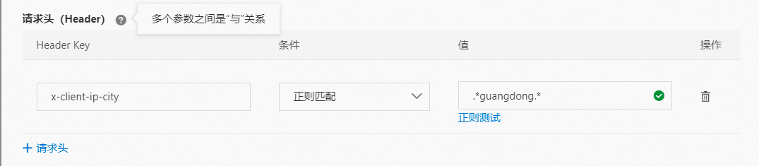 最后,在 MSE 云原生网关控制台,选择对应的 MSE 云原生网关,进入路由管理-路由配置中找到对应的路由进行编辑。请求头(Header)中设置为:x-client-ip-city 正则匹配 .*guangdong.*,如下图所示:
