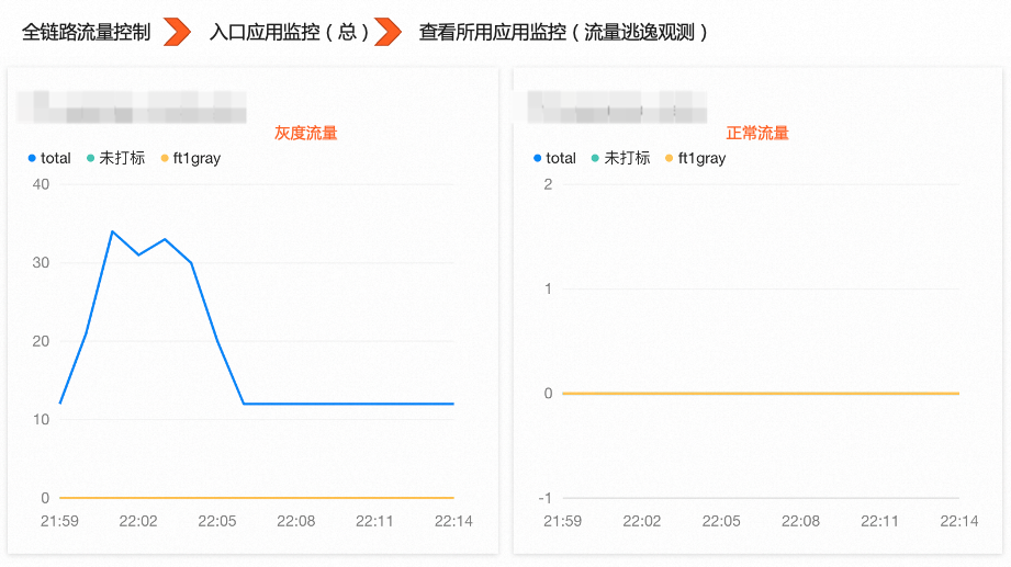 在全链路灰度发布场景下,由于生产环境会存在两个应用版本,具备较高的运维复杂度。为了能够在出现流量逃逸问题时尽早识别,需要具备灰度流量的可观测能力与逃逸告警能力,当出现非预期流量请求的情况下,开发人员能够通过监控视图对逃逸情况快速分析,并在第一时间通知到相应职能团队对告警进行处理。