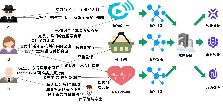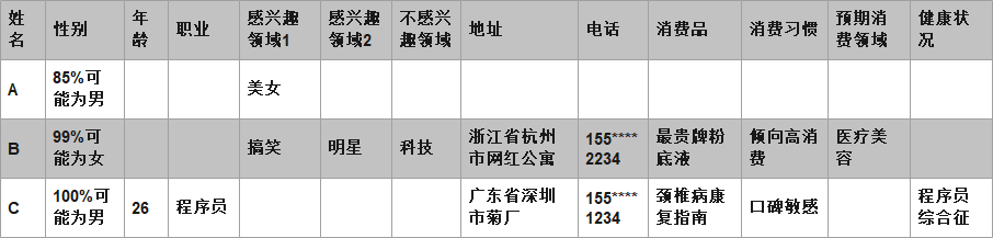 三个不同的用户在同一公司旗下的不同APP中留下了大量的行为数据,这些数据中包含了直接填写的用户资料、使用APP的具体行为以及领域专家对某些现象的标记,通过后台的标签算法可以得到这样的数据: