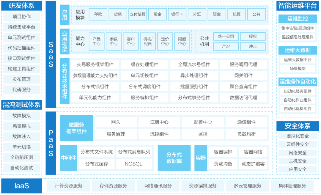 底层是IaaS云平台,中间是PaaS云原生平台,上层是SaaS核心应用领域,左侧为研发效能体系和混沌测试体系,右侧为智能运维体系和安全体系。上图七块内容形成新核心所需的整体能力框架。