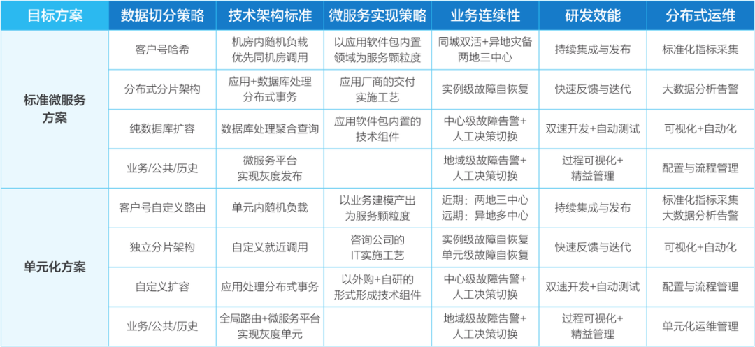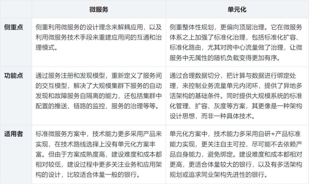 对于核心提供的分布式改造,有两种技术路线选择:一是微服务、二是单元化。微服务和单元化之间并不是一个包含关系,而是一种加强关系:单元化是微服务架构在宏观架构层面的增强,而微服务是单元化架构在微观机制层面的支撑。我们可以从多方面对比两者的差异。