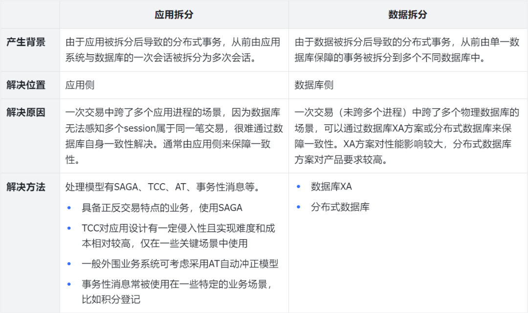 分布式事务最好的处理方式是“恰好不用解决”。即通过合理的应用规划和数据切分来有效地避免分布式事务的产生。所有的分布式事务处理机制都会带来不同程度的损耗,无论是在应用侧实现还是数据库侧实现。在数据库性能和容量允许的情况下,也会考虑将相关微服务组件对应的数据库进行合并,来减少因为数据拆分而产生的分布式事务,应用层也会考虑将关联的服务组件合并成一个微服务组件进行发布,以减少因为应用拆分而产生的分布式事务。
