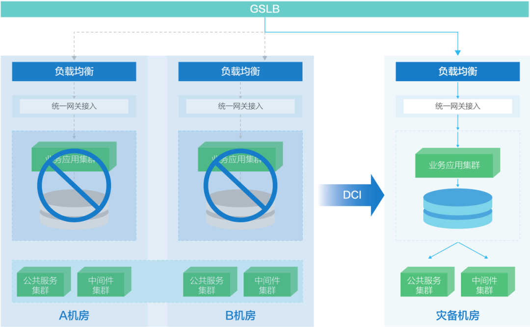 当数据库切换完成后,容灾中心的应用集群连到切换后的数据库,随后启动内部校验,确认无误后,在全局负载均衡服务(GSLB)中将流量指向异地的容灾中心,实现地域级故障的业务连续性保障能力。整体异地容灾切换的流程极为复杂,且与客户的实际运维环境有关。