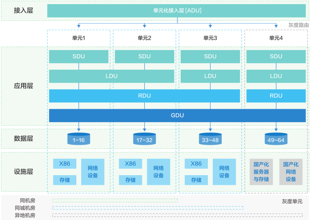 腾讯单元化架构是一种针对银行分布式核心系统技术架构的体系化、分层次、分领域的架构思想。接入层负责接收流量、识别流量、转发流量。识别后的流量被转发至应用层对应单元处理,单元默认按照客户维度拆分,单客户交易实现单元内闭环处理。跨客户交易存在一定比例的跨单元协同处理。数据默认被分为64份,被均匀放置在若干个单元内。可通过灰度机制将指定标签的客户放置在灰度单元实现生产灰度运行或验证。其中:接入单元(ADU)负责接入接出能力、标准处理单元(SDU)负责业务处理能力、本地单元(LDU)和同城单元(RDU)分别用于提供单AZ共享服务能力和同城共享服务能力、以及在异地多活架构中会涉及的全局类型服务则由全局单元(GDU)提供。