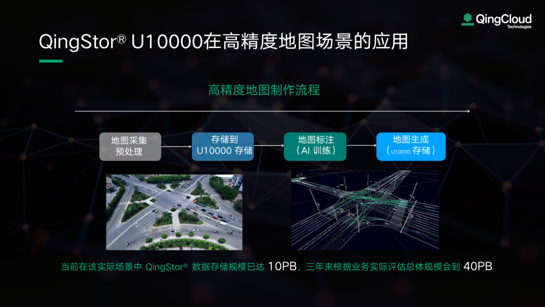在这个场景中,QingStor U10000 贯穿了整个高精度地图的全部制作过程,不仅负责海量地图数据的转储、标注、训练等,还需要对最终的地图数据做进行长期存储。